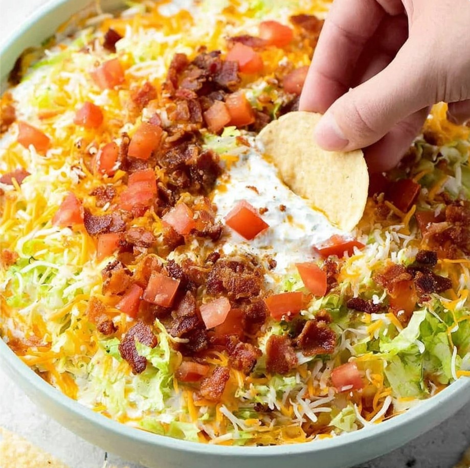 For best results, the toppings should be prepared separately. Tomatoes can be diced, lettuce and cheese shredded, and bacon cooked and crumbled the day before serving. Storing each ingredient in separate bags or containers keeps everything fresh, and the dip can be assembled just before serving for the best texture.