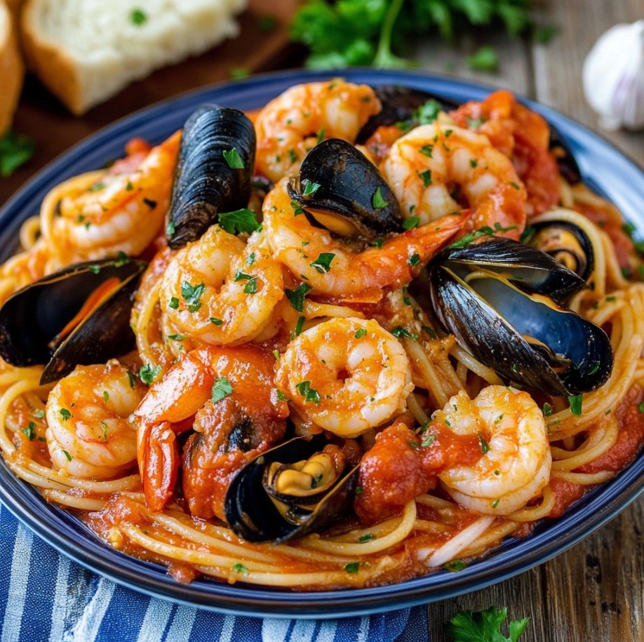 This seafood pasta is a beautiful combination of shrimp, clams, mussels, and scallops, all tossed with spaghetti in a rich homemade tomato sauce. It’s an easy yet elegant dish that’s perfect for dinner parties or special occasions at home. Every bite is packed with fresh seafood and savory Italian flavor.Easy Seafood Pasta Recipe