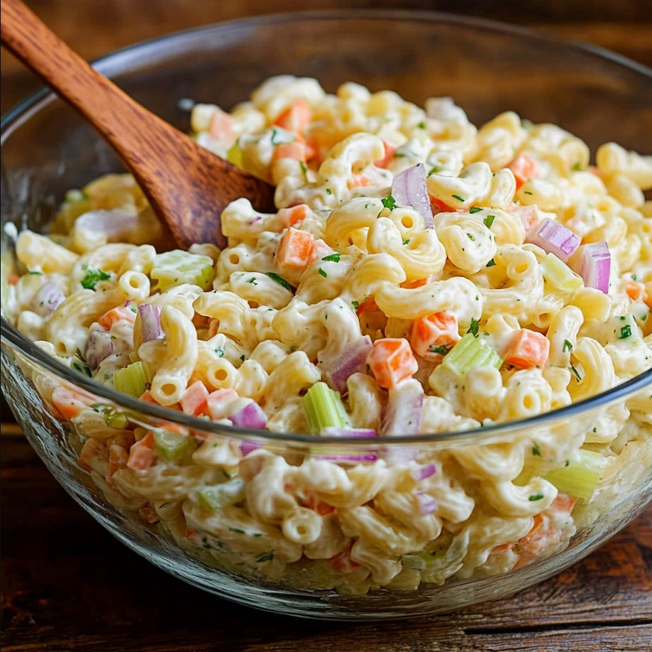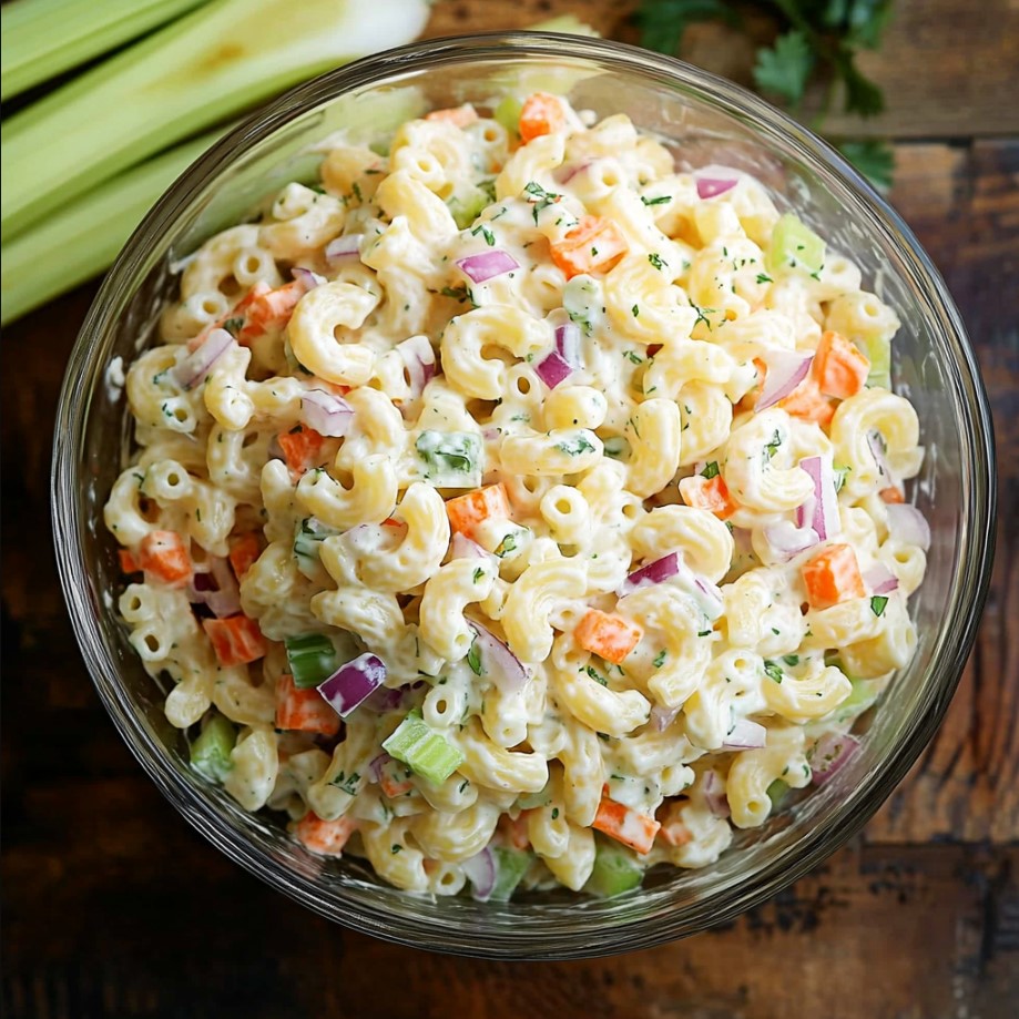 This is our go-to macaroni salad—the one that disappears first at every gathering. Tender elbow macaroni is tossed with crisp, colorful veggies like red onion, celery, and bell peppers, plus fresh herbs and a rich, creamy dressing that ties everything together beautifully.