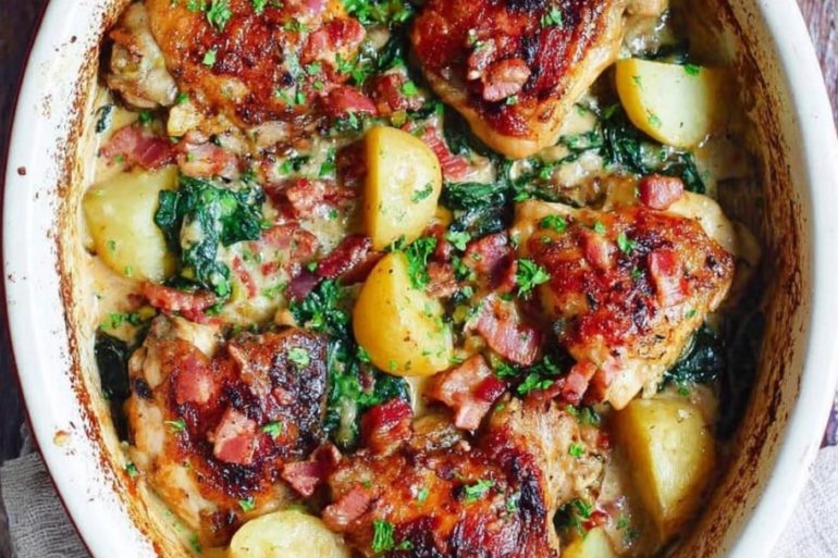 This Tuscan Chicken and Potatoes Casserole is the kind of comforting, hearty dish that instantly wins everyone over. You get crispy chicken and tender potatoes mixed with spinach, sun dried tomatoes, and smoky bacon bits, all coated in a rich and creamy Parmesan sauce that pulls everything together in the most satisfying way. At the…