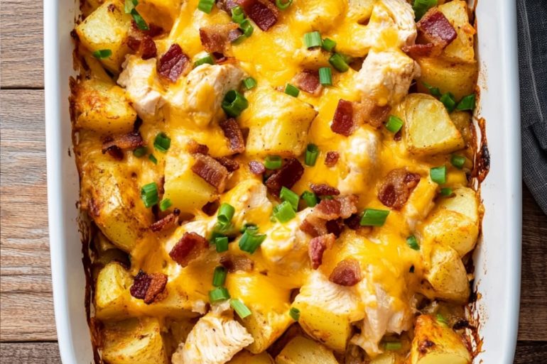 This Loaded Chicken and Potato Casserole is the ultimate comfort food—seasoned chicken and tender potatoes baked together to perfection. It’s topped with crispy bacon, melted cheese, and fresh green onions for a dish that’s rich, satisfying, and full of bold flavor. Whether you’re serving it for a weeknight dinner or feeding a hungry crowd, this…