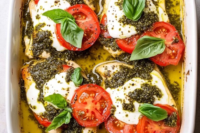 This Basil Pesto Tomato Mozzarella Chicken Bake is a simple, flavorful dinner that’s low carb, gluten-free, and made in just one pan! Juicy chicken is topped with basil pesto, fresh tomatoes, and melty mozzarella for a dish that’s both fresh and satisfying. As everything bakes together, the pan fills with delicious juices that are perfect…