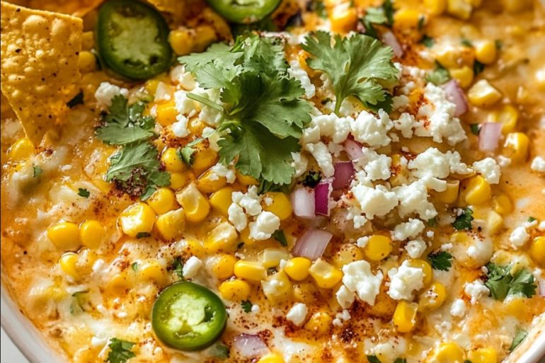 Mexican Street Corn Dip is a crowd-pleasing cheese dip that’s perfect for any gathering. This hot, cheesy, and spicy Elote-inspired dip combines cream cheese, sweet corn, hot sauce, jalapeños, and more for an irresistible appetizer. Whether you’re hosting a party or having a family game night, this dip always steals the show. Serve it hot…