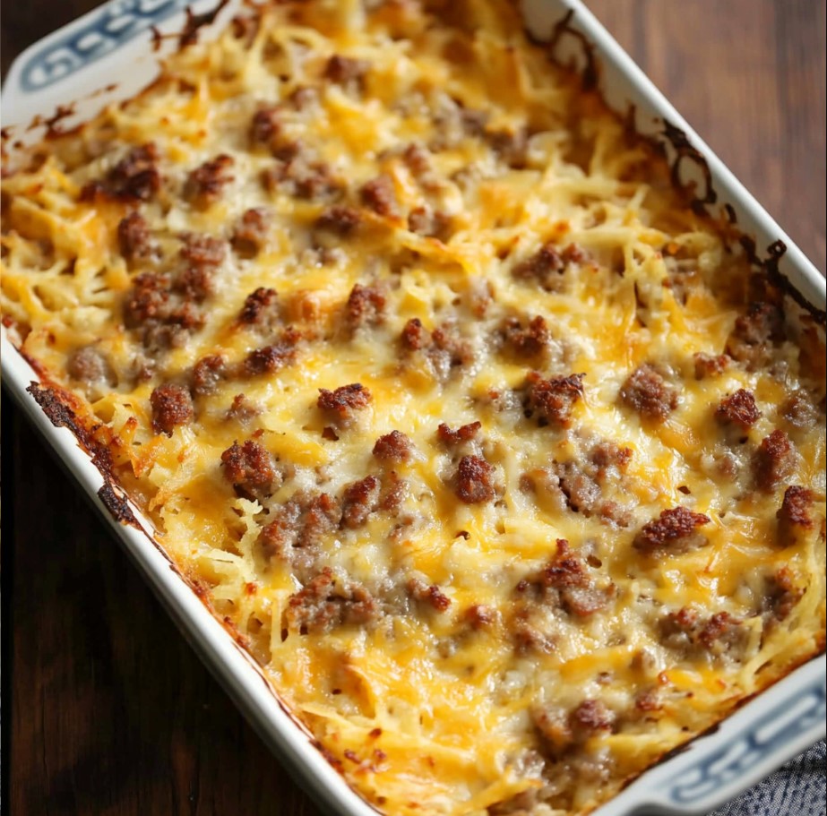 The dish is filled with classic breakfast ingredients that everyone loves. Frozen hash browns create a hearty base, while sausage, eggs, and melted cheese bring rich flavor and plenty of comfort.